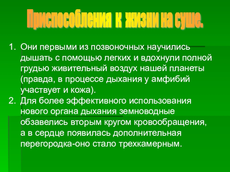 дышать с помощью легких и вдохнули полной грудью живительный воздух нашей планеты(правда, в процессе дыхания у амфибий участвует и кожа).