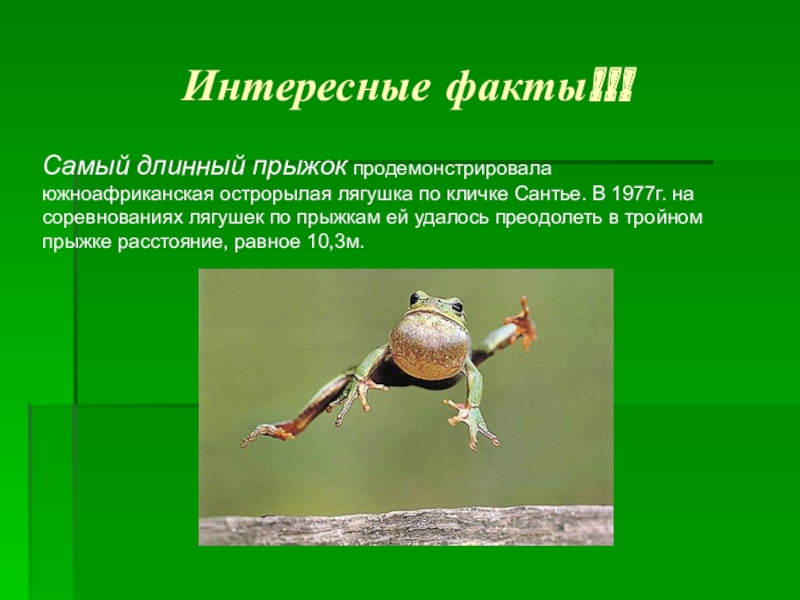 Самый длинный прыжок продемонстрировала южноафриканская острорылая лягушка по кличке Сантье.