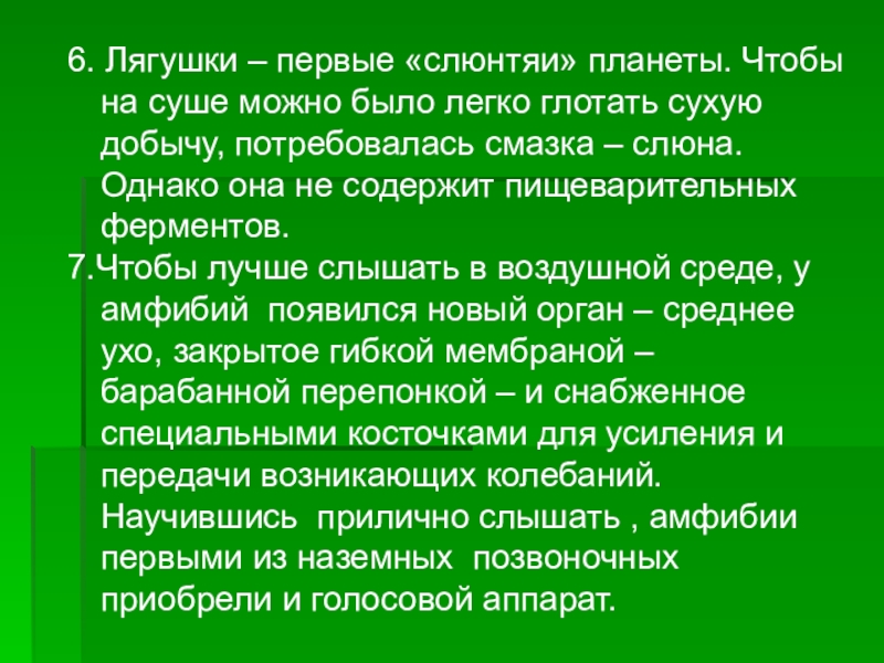 7.Чтобы лучше слышать в воздушной среде, у амфибий появился новый орган – среднее ухо, закрытое гибкой мембраной – барабанной перепонкой – и снабженное специальными косточками для усиления и передачи возникающих колебаний. Научившись прилично слышать , амфибии первыми из наземных позвоночных приобрели и голосовой аппарат.