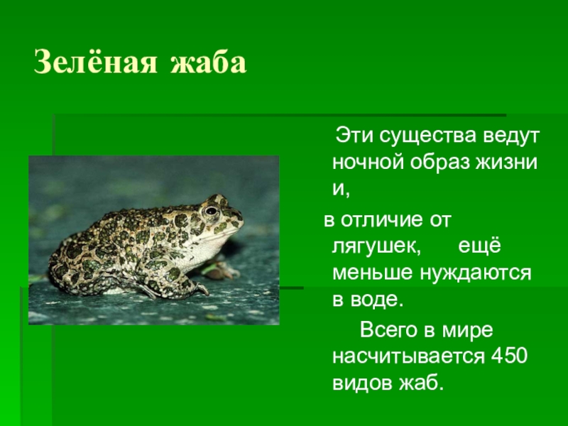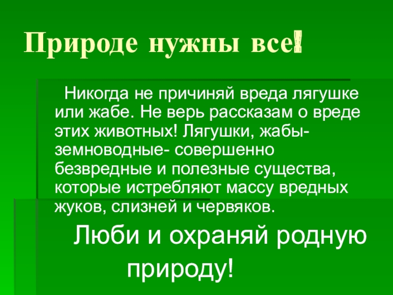 жабе. Не верь рассказам о вреде этих животных! Лягушки, жабы- земноводные- совершенно безвредные и полезные существа, которые истребляют массу вредных жуков, слизней и червяков.