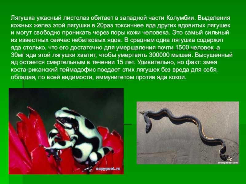 Слайд 27Лягушка ужасный листолаз обитает в западной части Колумбии. Выделения кожных желез