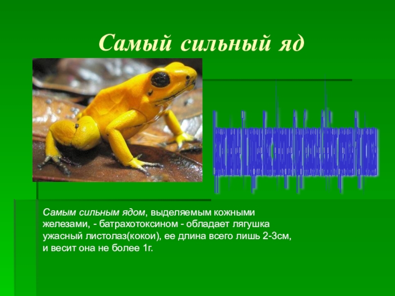 Самым сильным ядом, выделяемым кожными железами, - батрахотоксином - обладает лягушка ужасный листолаз(кокои), ее длина всего лишь 2-3см, и весит она не более 1г.