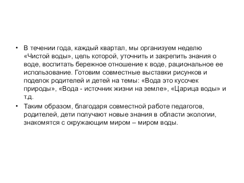 Таким образом, благодаря совместной работе педагогов, родителей, дети получают новые знания в области экологии, знакомятся с окружающим миром – миром воды.