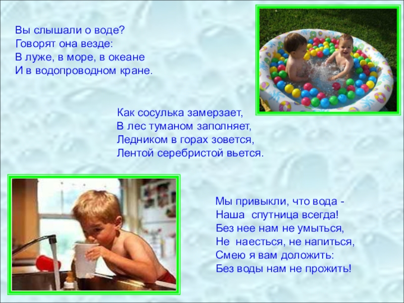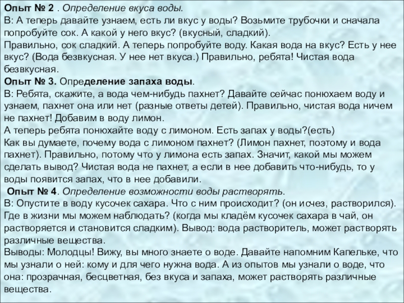 Выводы: Молодцы! Вижу, вы много знаете о воде. Давайте напомним Капельке, что мы узнали о ней: кому и для чего нужна вода. А из опытов мы узнали о воде, что она: прозрачная, бесцветная, без вкуса и запаха, может растворять различные вещества.