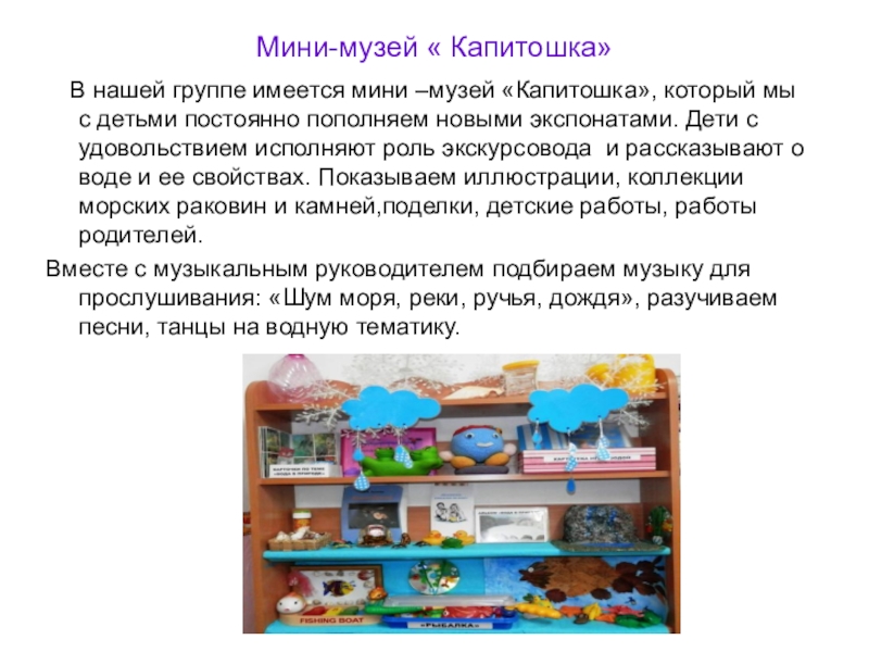 который мы с детьми постоянно пополняем новыми экспонатами. Дети с удовольствием исполняют роль экскурсовода и рассказывают о воде и ее свойствах. Показываем иллюстрации, коллекции морских раковин и камней,поделки, детские работы, работы родителей.