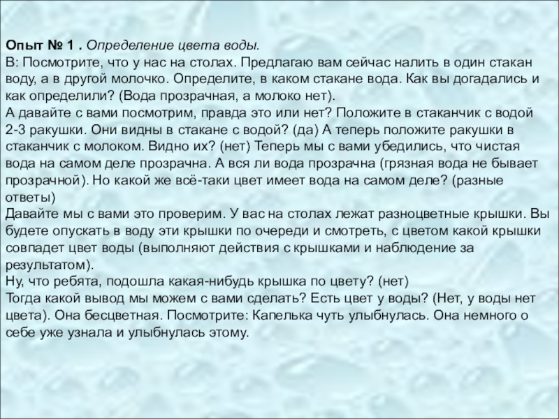 Тогда какой вывод мы можем с вами сделать? Есть цвет у воды? (Нет, у воды нет цвета). Она бесцветная. Посмотрите: Капелька чуть улыбнулась. Она немного о себе уже узнала и улыбнулась этому.