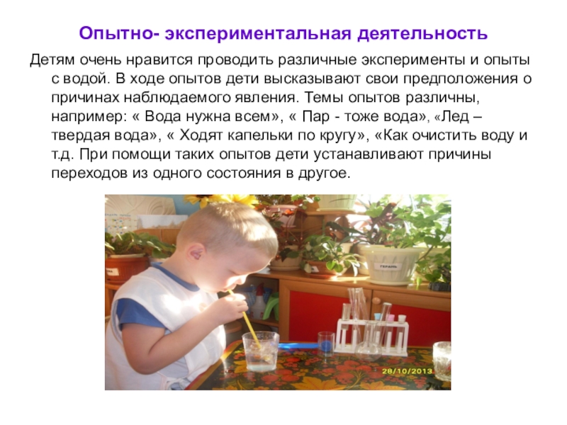 водой. В ходе опытов дети высказывают свои предположения о причинах наблюдаемого явления. Темы опытов различны, например: « Вода нужна всем», « Пар - тоже вода», «Лед – твердая вода», « Ходят капельки по кругу», «Как очистить воду и т.д. При помощи таких опытов дети устанавливают причины переходов из одного состояния в другое.