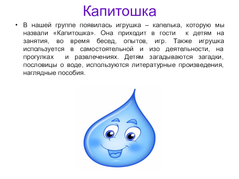 В нашей группе появилась игрушка – капелька, которую мы назвали «Капитошка».