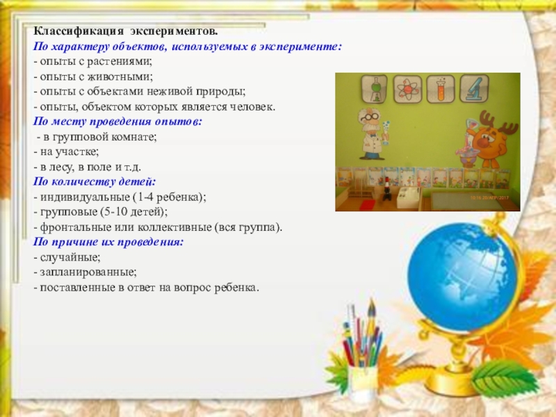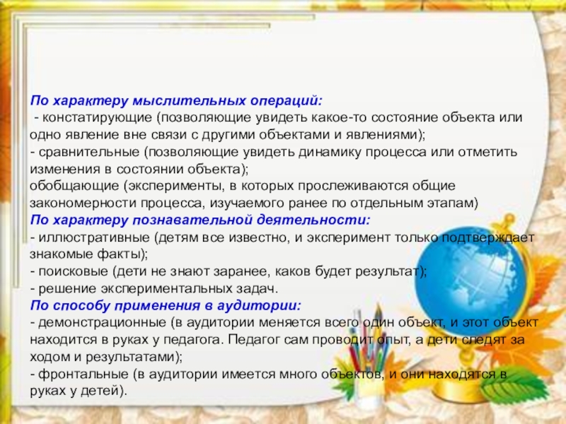 - демонстрационные (в аудитории меняется всего один объект, и этот объект находится в руках у педагога. Педагог сам проводит опыт, а дети следят за ходом и результатами);