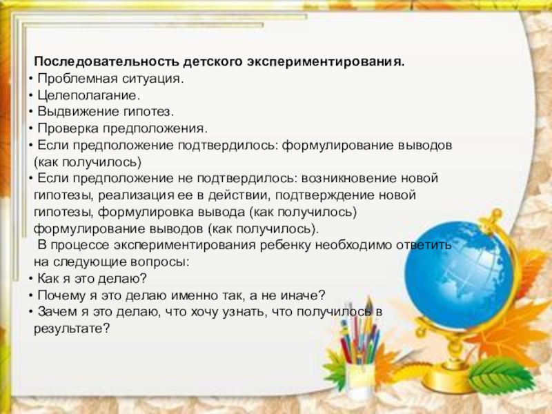 В процессе экспериментирования ребенку необходимо ответить на следующие вопросы: