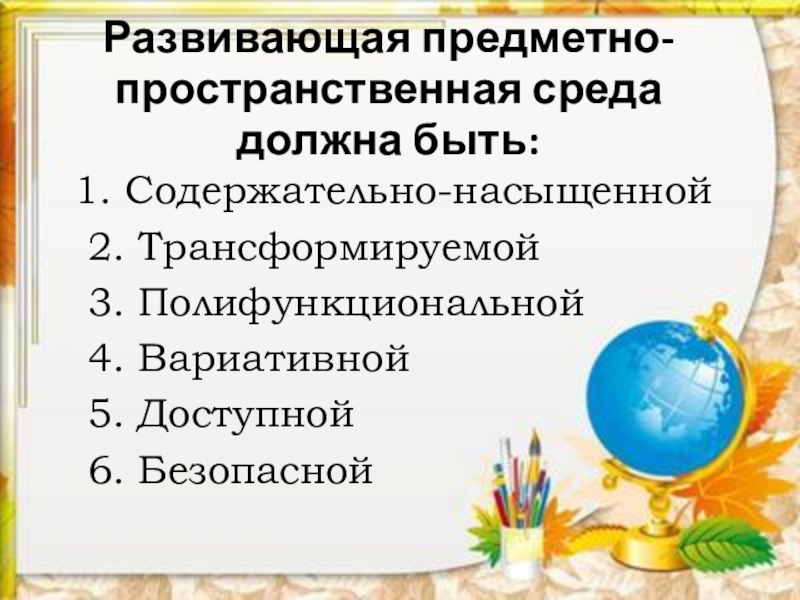 Слайд 12Развивающая предметно-пространственная среда должна быть: