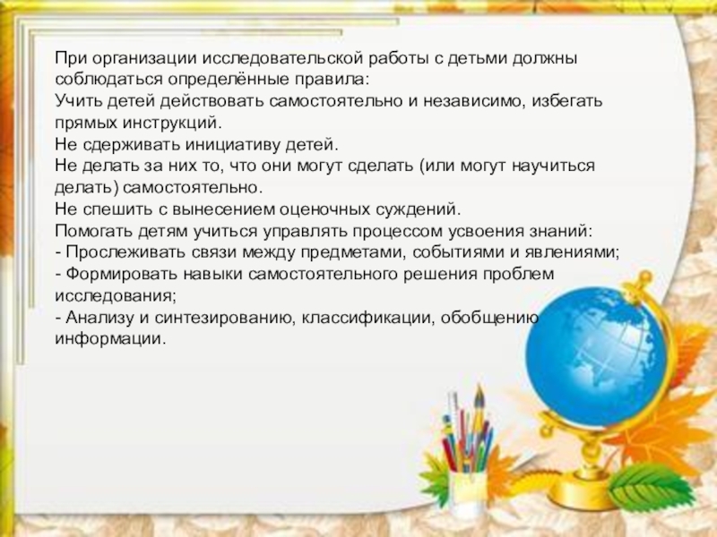 Слайд 8При организации исследовательской работы с детьми должны соблюдаться определённые правила: