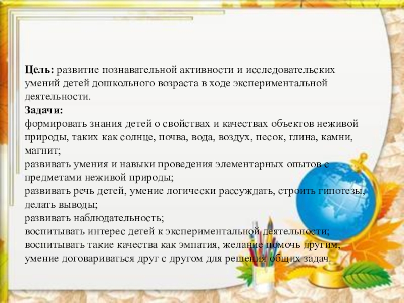 Цель: развитие познавательной активности и исследовательских умений детей дошкольного возраста в