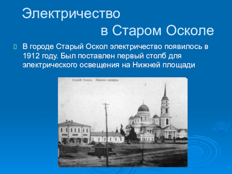 В городе Старый Оскол электричество появилось в 1912 году. Был поставлен первый столб для электрического освещения на Нижней площади
