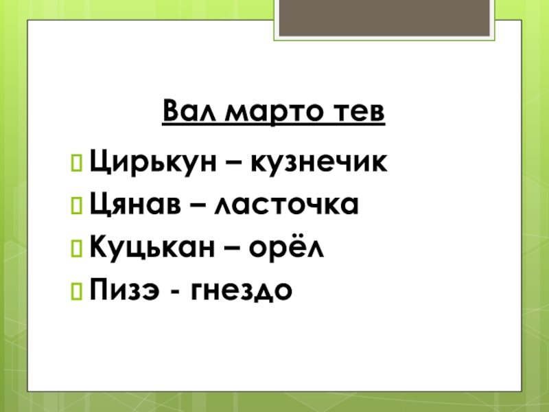 Вал марто тевЦирькун – кузнечикЦянав – ласточкаКуцькан – орёлПизэ - гнездо
