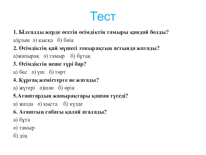Тест1. Ылғалды жерде өсетін өсімдіктің тамыры қандай болды?а)ұзын ә) қысқа  б) биік2. Өсімдіктің қай мүшесі топырақтың