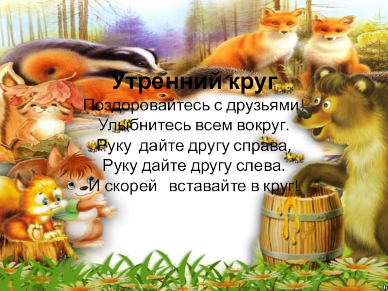 Слайд 3Утренний круг Поздоровайтесь с друзьями! Улыбнитесь всем вокруг. Руку дайте другу справа, Руку дайте другу
