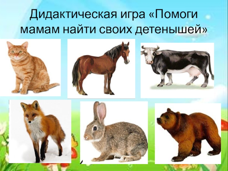 Слайд 12Дидактическая игра «Помоги мамам найти своих детенышей»