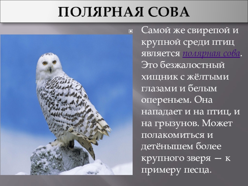 Самой же свирепой и крупной среди птиц является полярная сова. Это