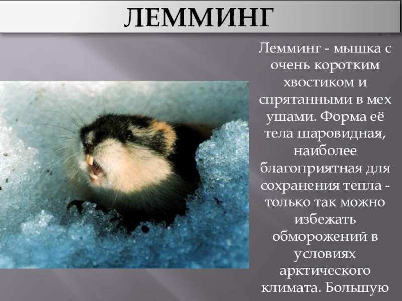 ушами. Форма её тела шаровидная, наиболее благоприятная для сохранения тепла - только так можно избежать обморожений в условиях арктического климата. Большую часть года лемминги живут под снегом