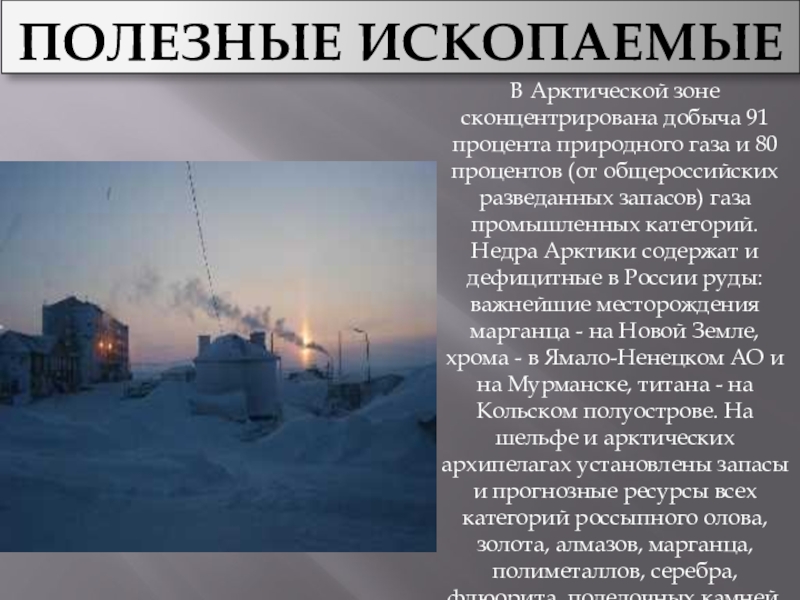 80 процентов (от общероссийских разведанных запасов) газа промышленных категорий. Недра Арктики содержат и дефицитные в России руды: важнейшие месторождения марганца - на Новой Земле, хрома - в Ямало-Ненецком АО и на Мурманске, титана - на Кольском полуострове. На шельфе и арктических архипелагах установлены запасы и прогнозные ресурсы всех категорий россыпного олова, золота, алмазов, марганца, полиметаллов, серебра, флюорита, поделочных камней, различных самоцветов