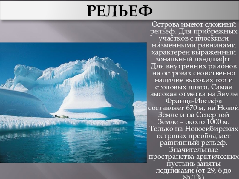 характерен выраженный зональный ландшафт. Для внутренних районов на островах свойственно наличие высоких гор и столовых плато. Самая высокая отметка на Земле Франца-Иосифа составляет 670 м, на Новой Земле и на Северной Земле – около 1000 м. Только на Новосибирских островах преобладает равнинный рельеф. Значительные пространства арктических пустынь заняты ледниками (от 29, 6 до 85,1%)