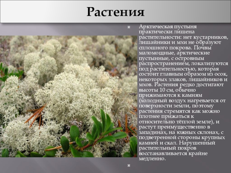 образуют сплошного покрова. Почвы маломощные, арктические пустынные, с островным распространением, локализуются под растительностью, которая состоит главным образом из осок, некоторых злаков, лишайников и мхов. Растения редко достигают высоты 10 см, обычно прижимаются к камням (холодный воздух нагревается от поверхности земли, поэтому растения стремятся как можно плотнее прижаться к относительно тёплой земле), и растут преимущественно в западинах, на южных склонах, с подветренной стороны крупных камней и скал. Нарушенный растительный покров восстанавливается крайне медленно.