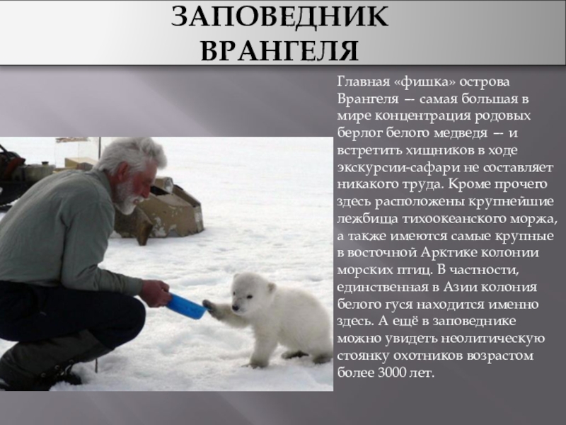 берлог белого медведя — и встретить хищников в ходе экскурсии-сафари не составляет никакого труда. Кроме прочего здесь расположены крупнейшие лежбища тихоокеанского моржа, а также имеются самые крупные в восточной Арктике колонии морских птиц. В частности, единственная в Азии колония белого гуся находится именно здесь. А ещё в заповеднике можно увидеть неолитическую стоянку охотников возрастом более 3000 лет.