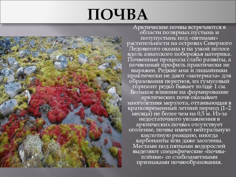 растительности на островах Северного Ледовитого океана и на узкой полосе вдоль азиатского побережья материка. Почвенные процессы слабо развиты, а почвенный профиль практически не выражен. Редкие мхи и лишайники практически не дают «материала» для образования перегноя, их гумусовый горизонт редко бывает толще 1 см. Большое влияние на формирование арктических почв оказывает многолетняя мерзлота, оттаивающая в кратковременный летний период (1–2 месяца) не более чем на 0,5 м. Из-за недостаточного увлажнения в арктических почвах отсутствует оголение, почвы имеют нейтральную кислотную реакцию, иногда карбонанты или даже засолены. Местами под пятнами водорослей выделяют специфические «почвы-плёнки» со слабозаметными признаками почвообразования.