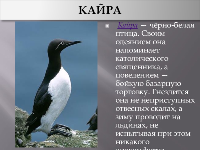 Кайра — чёрно-белая птица. Своим одеянием она напоминает католического священника, а поведением —