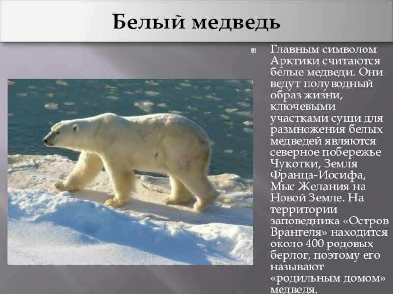 жизни, ключевыми участками суши для размножения белых медведей являются северное побережье Чукотки, Земля Франца-Иосифа, Мыс Желания на Новой Земле. На территории заповедника «Остров Врангеля» находится около 400 родовых берлог, поэтому его называют «родильным домом» медведя.