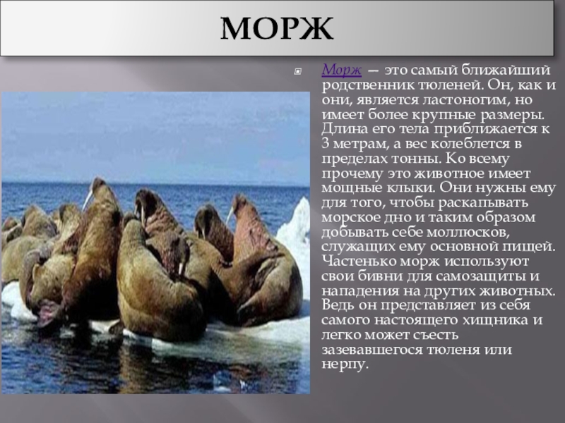 ластоногим, но имеет более крупные размеры. Длина его тела приближается к 3 метрам, а вес колеблется в пределах тонны. Ко всему прочему это животное имеет мощные клыки. Они нужны ему для того, чтобы раскапывать морское дно и таким образом добывать себе моллюсков, служащих ему основной пищей. Частенько морж используют свои бивни для самозащиты и нападения на других животных. Ведь он представляет из себя самого настоящего хищника и легко может съесть зазевавшегося тюленя или нерпу.