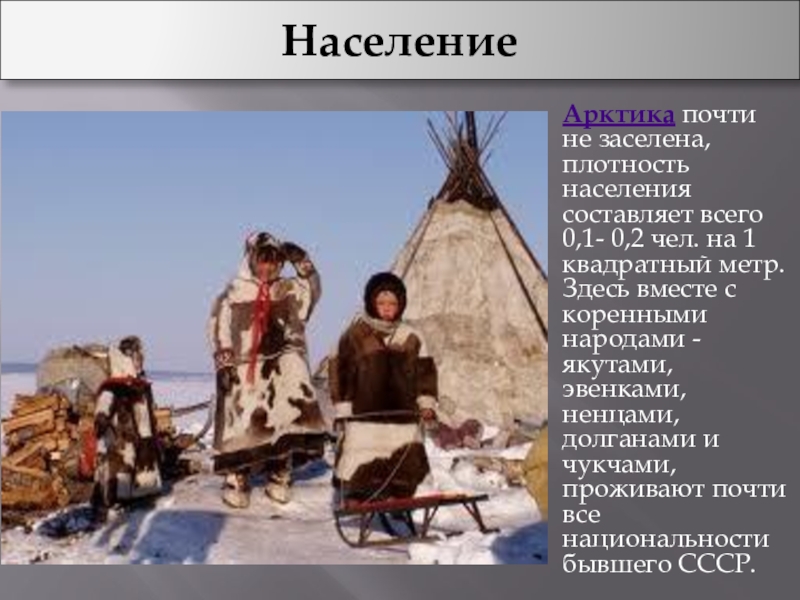 Арктика почти не заселена, плотность населения составляет всего 0,1- 0,2 чел. на