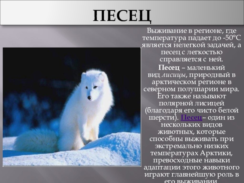 Песец – маленький вид лисицы, природный в арктическом регионе в северном полушарии мира. Его также называют полярной лисицей (благодаря его чисто белой шерсти). Песец– один из нескольких видов животных, которые способны выживать при экстремально низких температурах Арктики, превосходные навыки адаптации этого животного играют главнейшую роль в его выживании.