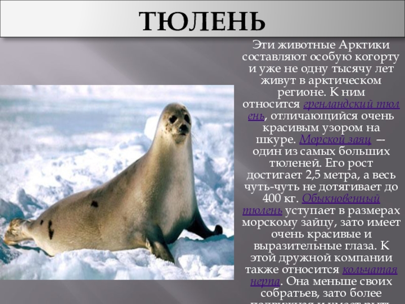 лет живут в арктическом регионе. К ним относится гренландский тюлень, отличающийся очень красивым узором на шкуре. Морской заяц — один из самых больших тюленей. Его рост достигает 2,5 метра, а весь чуть-чуть не дотягивает до 400 кг. Обыкновенный тюлень уступает в размерах морскому зайцу, зато имеет очень красивые и выразительные глаза. К этой дружной компании также относится кольчатая нерпа. Она меньше своих собратьев, зато более подвижная и умеет рыть норы в снегу.