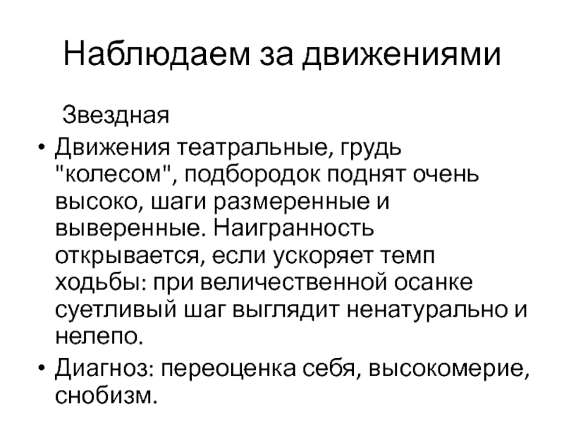 размеренные и выверенные. Наигранность открывается, если ускоряет темп ходьбы: при величественной осанке суетливый шаг выглядит ненатурально и нелепо.