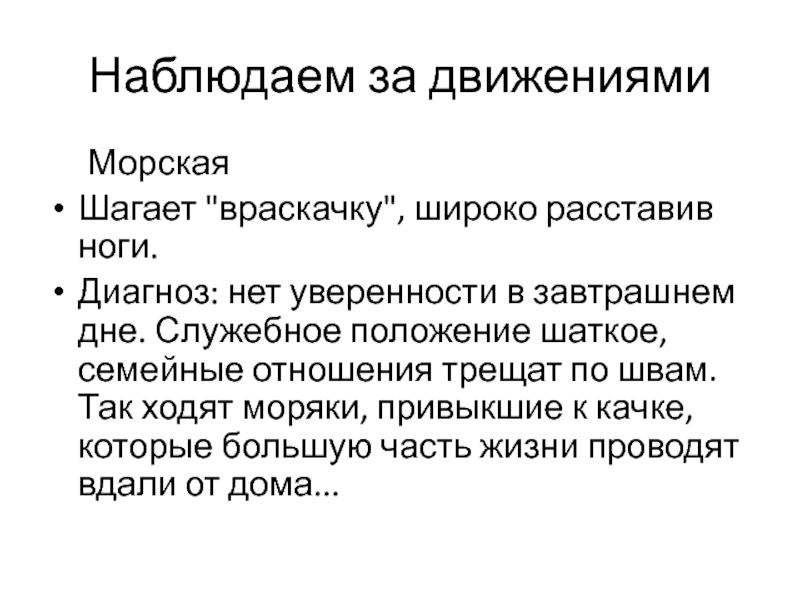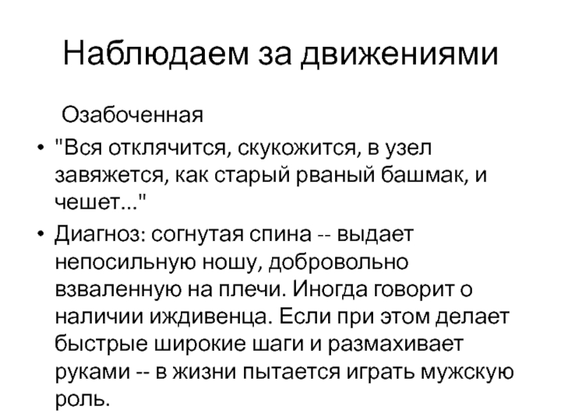 Диагноз: согнутая спина -- выдает непосильную ношу, добровольно взваленную на плечи. Иногда говорит о наличии иждивенца. Если при этом делает быстрые широкие шаги и размахивает руками -- в жизни пытается играть мужскую роль.