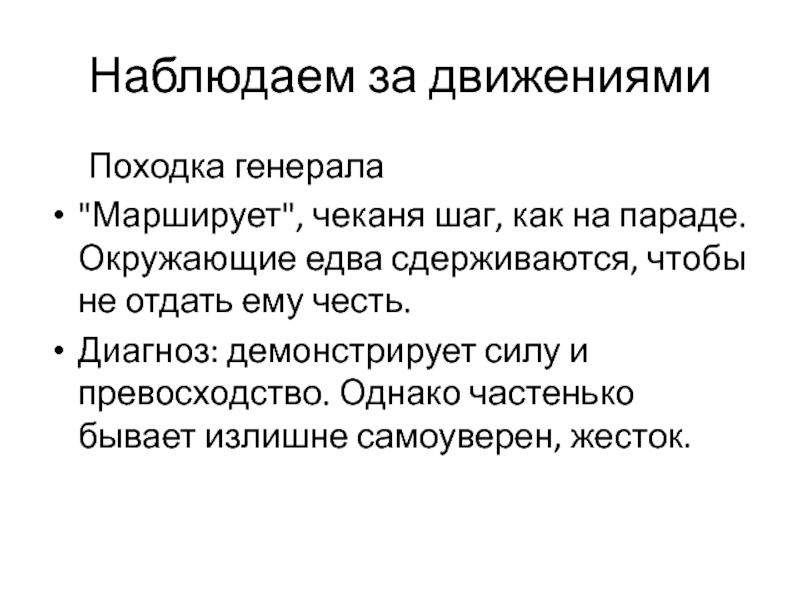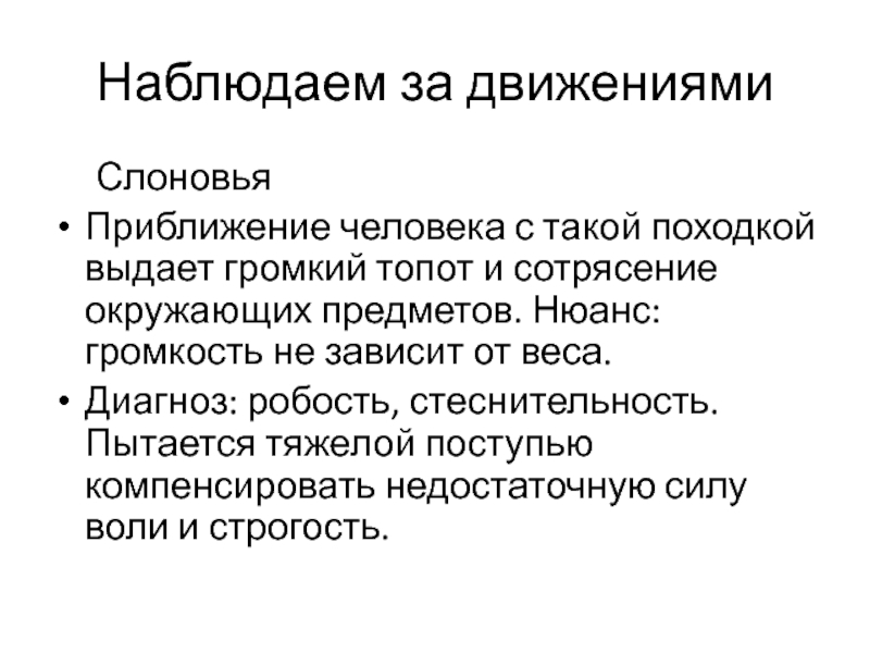 Диагноз: робость, стеснительность. Пытается тяжелой поступью компенсировать недостаточную силу воли и строгость.