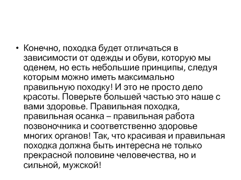 Слайд 4Конечно, походка будет отличаться в зависимости от одежды и обуви, которую