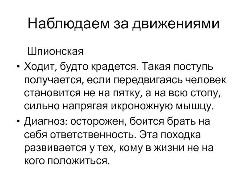 Диагноз: осторожен, боится брать на себя ответственность. Эта походка развивается у тех, кому в жизни не на кого положиться.