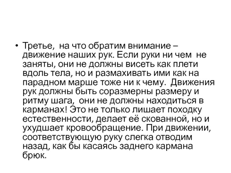 ни чем не заняты, они не должны висеть как плети вдоль тела, но и размахивать ими как на парадном марше тоже ни к чему. Движения рук должны быть соразмерны размеру и ритму шага, они не должны находиться в карманах! Это не только лишает походку естественности, делает её скованной, но и ухудшает кровообращение. При движении, соответствующую руку слегка отводим назад, как бы касаясь заднего кармана брюк.