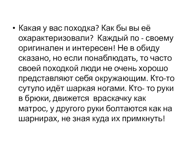 Слайд 2Какая у вас походка? Как бы вы её охарактеризовали? Каждый по