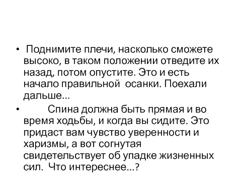 Слайд 10 Поднимите плечи, насколько сможете высоко, в таком положении отведите их