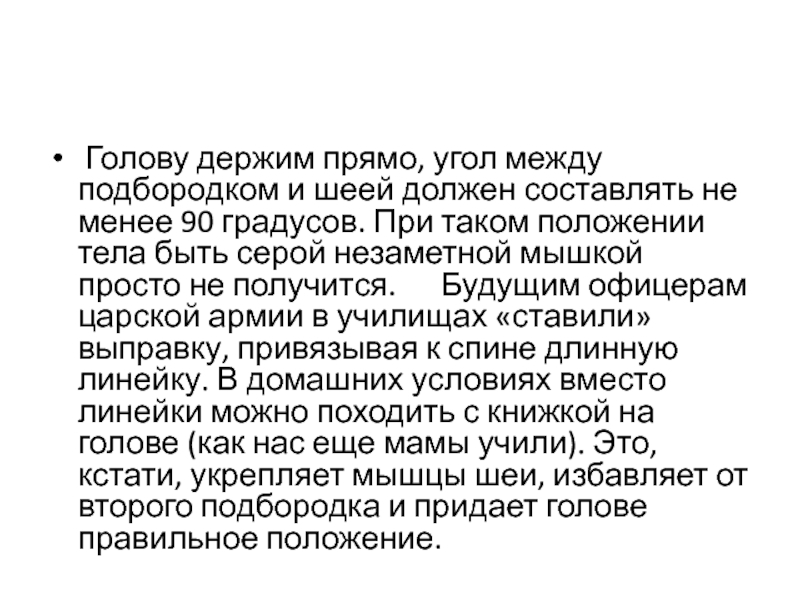 не менее 90 градусов. При таком положении тела быть серой незаметной мышкой просто не получится. Будущим офицерам царской армии в училищах «ставили» выправку, привязывая к спине длинную линейку. В домашних условиях вместо линейки можно походить с книжкой на голове (как нас еще мамы учили). Это, кстати, укрепляет мышцы шеи, избавляет от второго подбородка и придает голове правильное положение.