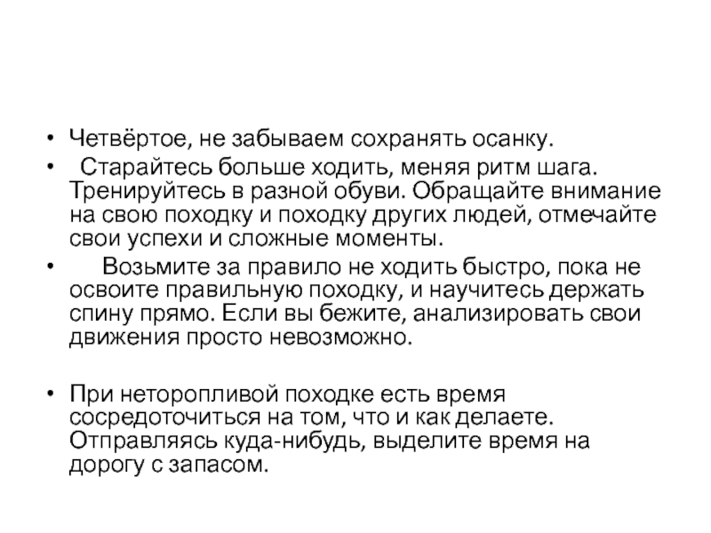 При неторопливой походке есть время сосредоточиться на том, что и как делаете. Отправляясь куда-нибудь, выделите время на дорогу с запасом.