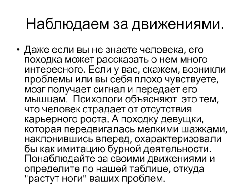 рассказать о нем много интересного. Если у вас, скажем, возникли проблемы или вы себя плохо чувствуете, мозг получает сигнал и передает его мышцам. Психологи объясняют это тем, что человек страдает от отсутствия карьерного роста. А походку девущки, которая передвигалась мелкими шажками, наклонившись вперед, охарактеризовали бы как имитацию бурной деятельности. Понаблюдайте за своими движениями и определите по нашей таблице, откуда "растут ноги" ваших проблем.