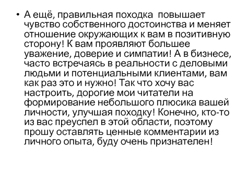 окружающих к вам в позитивную сторону! К вам проявляют большее уважение, доверие и симпатии! А в бизнесе, часто встречаясь в реальности с деловыми людьми и потенциальными клиентами, вам как раз это и нужно! Так что хочу вас настроить, дорогие мои читатели на формирование небольшого плюсика вашей личности, улучшая походку! Конечно, кто-то из вас преуспел в этой области, поэтому прошу оставлять ценные комментарии из личного опыта, буду очень признателен!