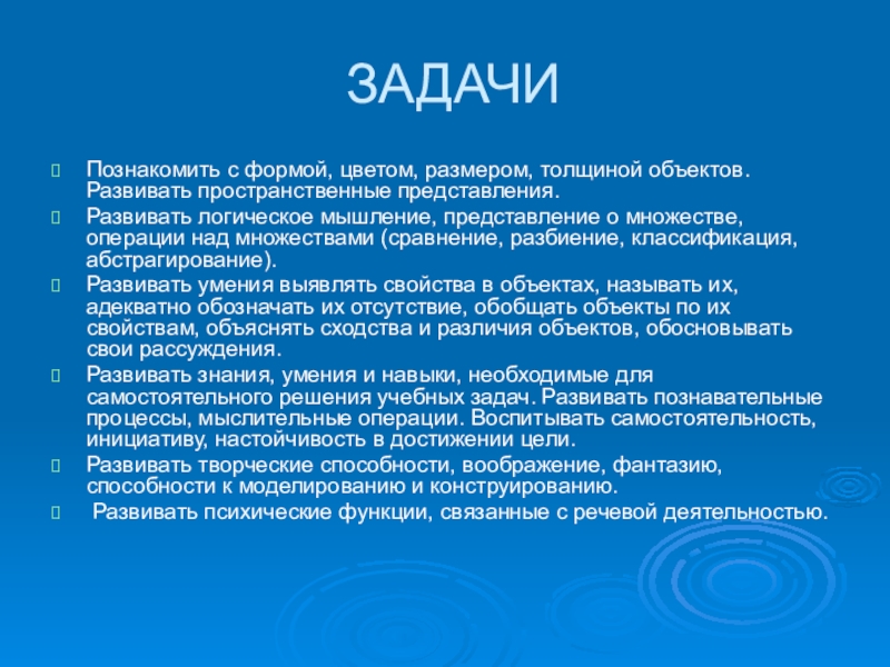 Познакомить с формой, цветом, размером, толщиной объектов. Развивать пространственные представления.