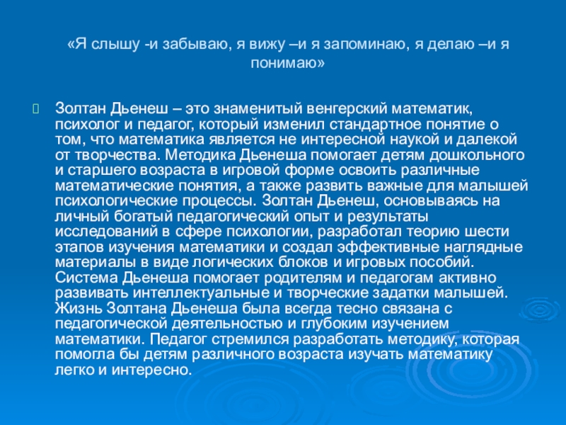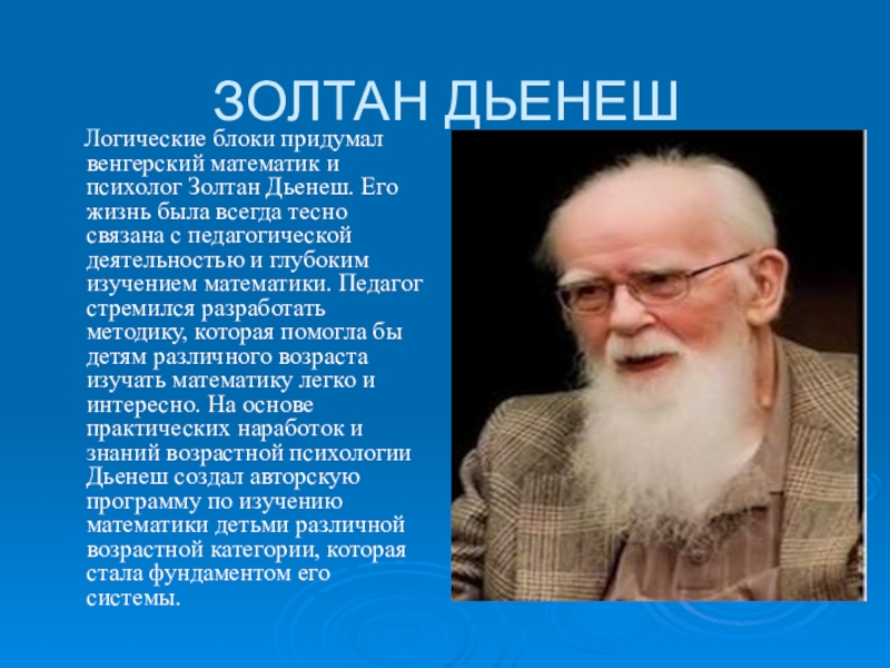 Золтан Дьенеш. Его жизнь была всегда тесно связана с педагогической деятельностью и глубоким изучением математики. Педагог стремился разработать методику, которая помогла бы детям различного возраста изучать математику легко и интересно. На основе практических наработок и знаний возрастной психологии Дьенеш создал авторскую программу по изучению математики детьми различной возрастной категории, которая стала фундаментом его системы.