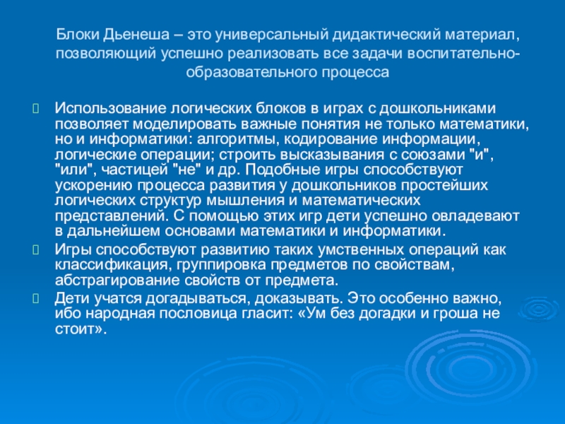 Использование логических блоков в играх с дошкольниками позволяет моделировать важные понятия не только математики, но и информатики: алгоритмы, кодирование информации, логические операции; строить высказывания с союзами "и", "или", частицей "не" и др. Подобные игры способствуют ускорению процесса развития у дошкольников простейших логических структур мышления и математических представлений. С помощью этих игр дети успешно овладевают в дальнейшем основами математики и информатики.